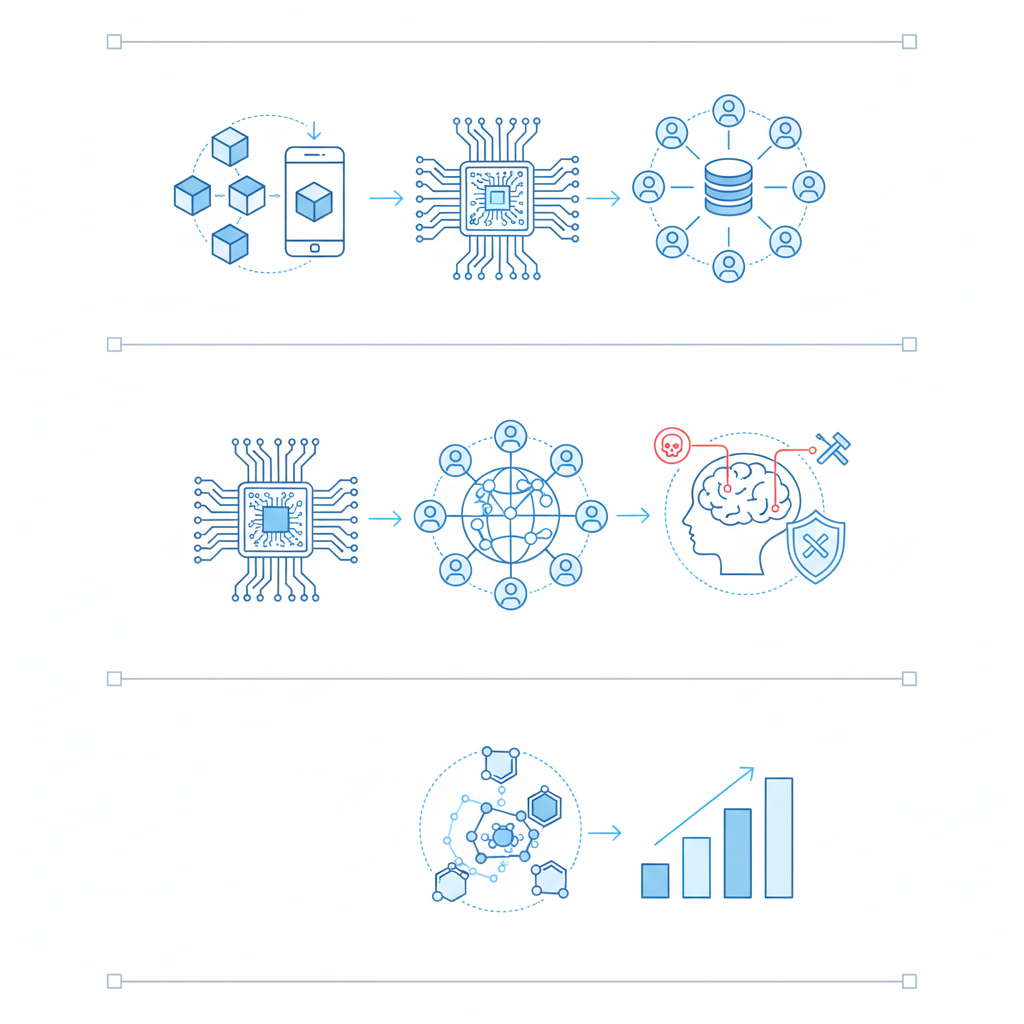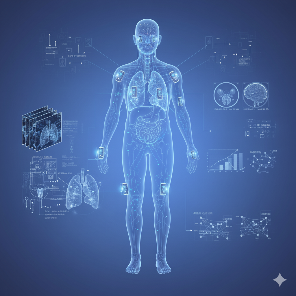 - 실시간 개인 건강 모니터링 및 예측 진단: 개인이 스마트폰에 탑재된 모듈형 시스템을 이용해 비침습적으로 피부, 귀, 치아 등의 건강 상태를 상시 점검합니다. 정기적으로 찍은 안저 이미지 한 장만으로 심혈관 대사 위험 요소(당뇨, 고혈압, 비만 등)를 동시에 예측하여 조기에 진단 정보를 제공합니다. 나아가 초음파 기술을 활용하여 혈관 내 세포의 흐름을 비침습적으로 모니터링하는 기술을 통합하여 암세포나 염증세포의 활동 징후를 실시간으로 탐지합니다. 수집된 의료 영상 데이터(CT, MRI)는 고화질의 3차원 볼륨 데이터로 재구성되어, 폐 결절 및 뇌 건강 상태를 정밀 분석하는 데 활용됩니다.