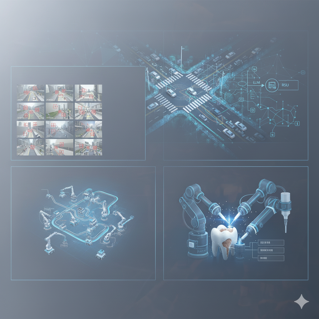 - 협업 로봇 기반 정밀 작업 및 이동성 확보: 도시 교통 시스템에서는 RSU(도로변 통신 장치)와 차량 간의 다양한 V2X 메시지를 융합하여 신뢰성 높은 통합 상황 인식 데이터를 100ms마다 생성하고, 대형 언어 모델(LLM) 기반의 시공간 예측 프레임워크를 활용해 급변하는 교통 상황을 정확하게 예측합니다. 또한, 사용자의 자연어 요청을 기반으로 최적의 다목적 경로를 계획하는 시스템을 통합하여, 물류 및 개인 이동의 효율을 극대화합니다. 제조 및 의료 현장에서는 복수의 로봇 팔들이 충돌 없이 효율적인 경로를 계산하며 정밀 작업을 수행합니다. 특히 치과 등 정밀 수술 분야에서는 7자유도 로봇이 충치 제거 등 복합 수술을 정밀하게 수행하고, 제조 현장의 회전 기계는 진동 데이터를 통해 순간 각속도를 정확히 추정하여 고장을 예측합니다.