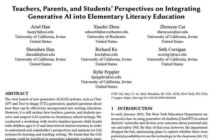 이 글에서는 2024년도 CHI에서 발표된 “Teachers, Parents, and Students’ perspectives on Integrating Generative AI into Elementary Literacy Education“ 라는 논문의 내용을 소개합니다. 이미 아시겠지만, CHI는 Human-Computer Interaction 분야에서 최고의 권위를 가지는 국제학회입니다.