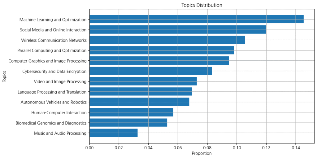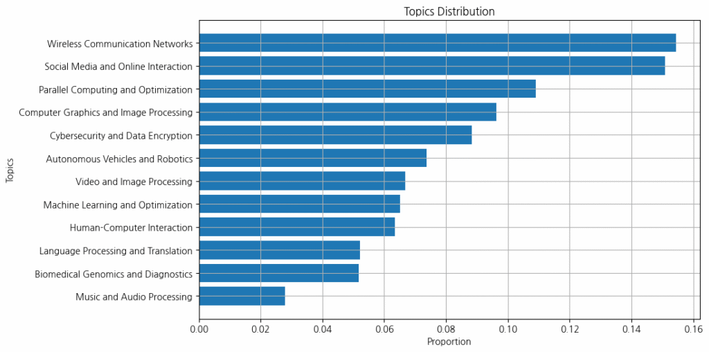 그림 1에 의하면, 상위 5개 주제는 Machine Learning and Optimization, Social Media and Online Interaction, Wireless Communication Networks, Parallel Computing and Optimization, Computer Graphics and Image Processing 으로 나타났습니다.