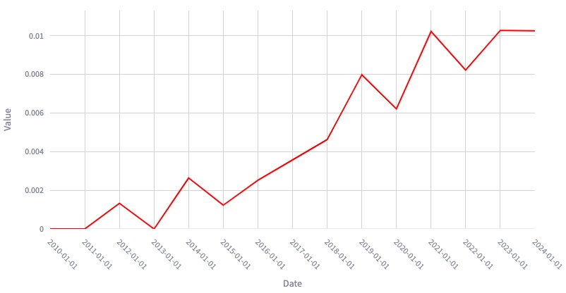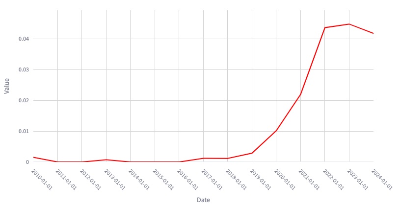 그림 3은 최근에 자율 주행 장치에서 많이 활용되고 있는 ‘LiDAR’에 대해 언급한 논문들이 차지하는 비중의 흐름입니다. 지속적으로 상승하는 흐름을 보여주네요. (참고로, 2024년의 1년 동안에는 총 11개 연구팀에서 ‘LiDAR’를 언급한 26개의 연구결과를 발표하였습니다.)