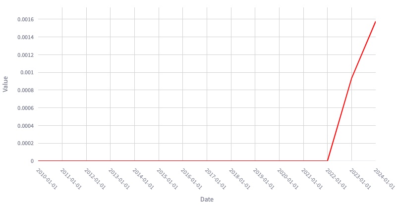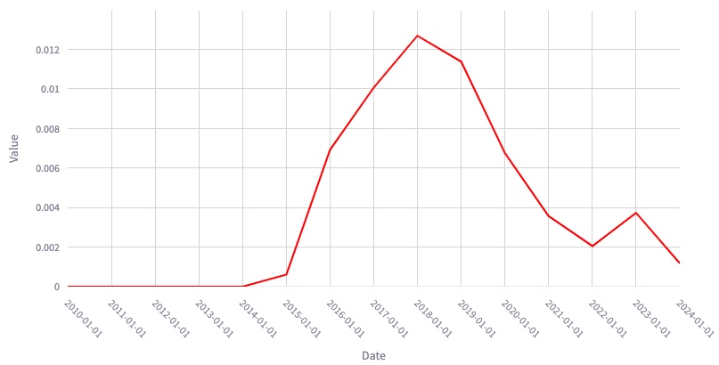 그림 5는 LSTM을 언급한 국내 연구팀 논문의 비중 추세를 보여줍니다. 2015년부터 언급되기 시작하여 2018년에 절정에 달한 이후로 지속적으로 감소하는 추세를 보입니다. 이에 비해, 그림 6에서 확인할 수 있는 바와 같이 transformer를 언급한 국내 연구팀 논문의 비중은 2019년부터 빠르게 증가하고 있습니다.