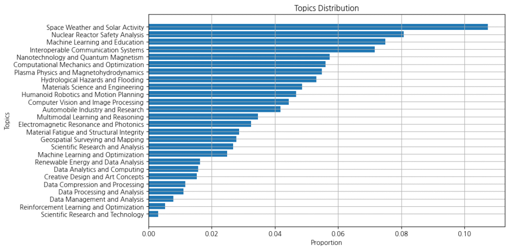 위와 같은 세부 주제의 분포 특성으로 볼 때, AIFrenz에서 활동하는 연구자들에게서는 전통적인 공학 분야(기계, 재료)와 첨단 기술(기계학습, 나노, 플라즈마, 네트워크, 로봇) 분야 뿐만 아니라 우주, 환경, 핵 에너지 분야의 전문성이 나타날 것으로 보입니다. 또한 AI 교육 관련 전문가들도 포함되어 있다는 점에 주목할 만 합니다.
